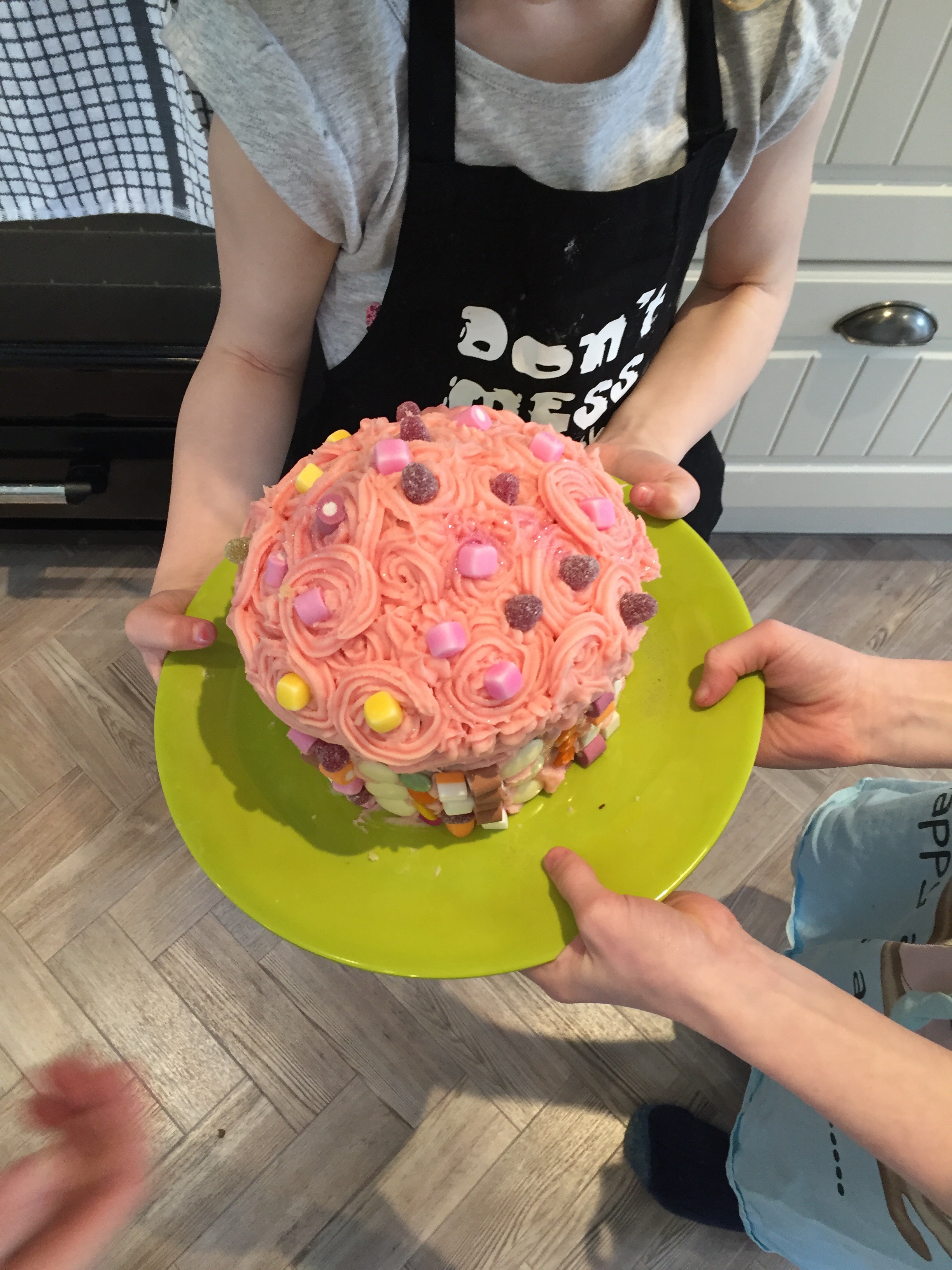 Put the rest of the buttercream in a piping bag fitted with a star nozzle. Pipe swirls onto the top of the cake to look like flowers. Stick sweets in to the middle of each flower. Enjoy!