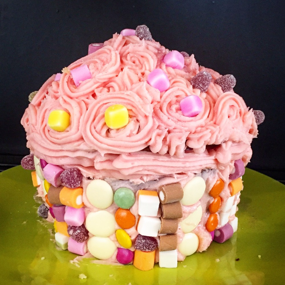 Trim the cakes using a serrated knife so the have a flat surface to stick together. Pop the base on a board or serving plate. Use a pallet knife to roughly cover the bottom section with buttercream. Cover with sweets. Put more buttercream on the top of the base and put the top of the cake on top, gently press down to stick.