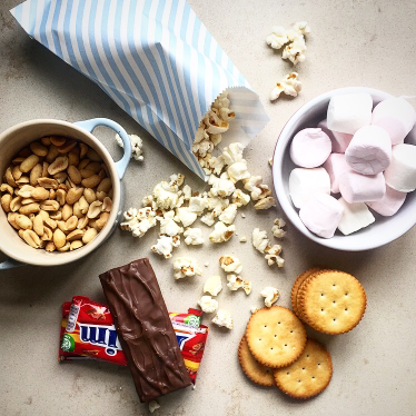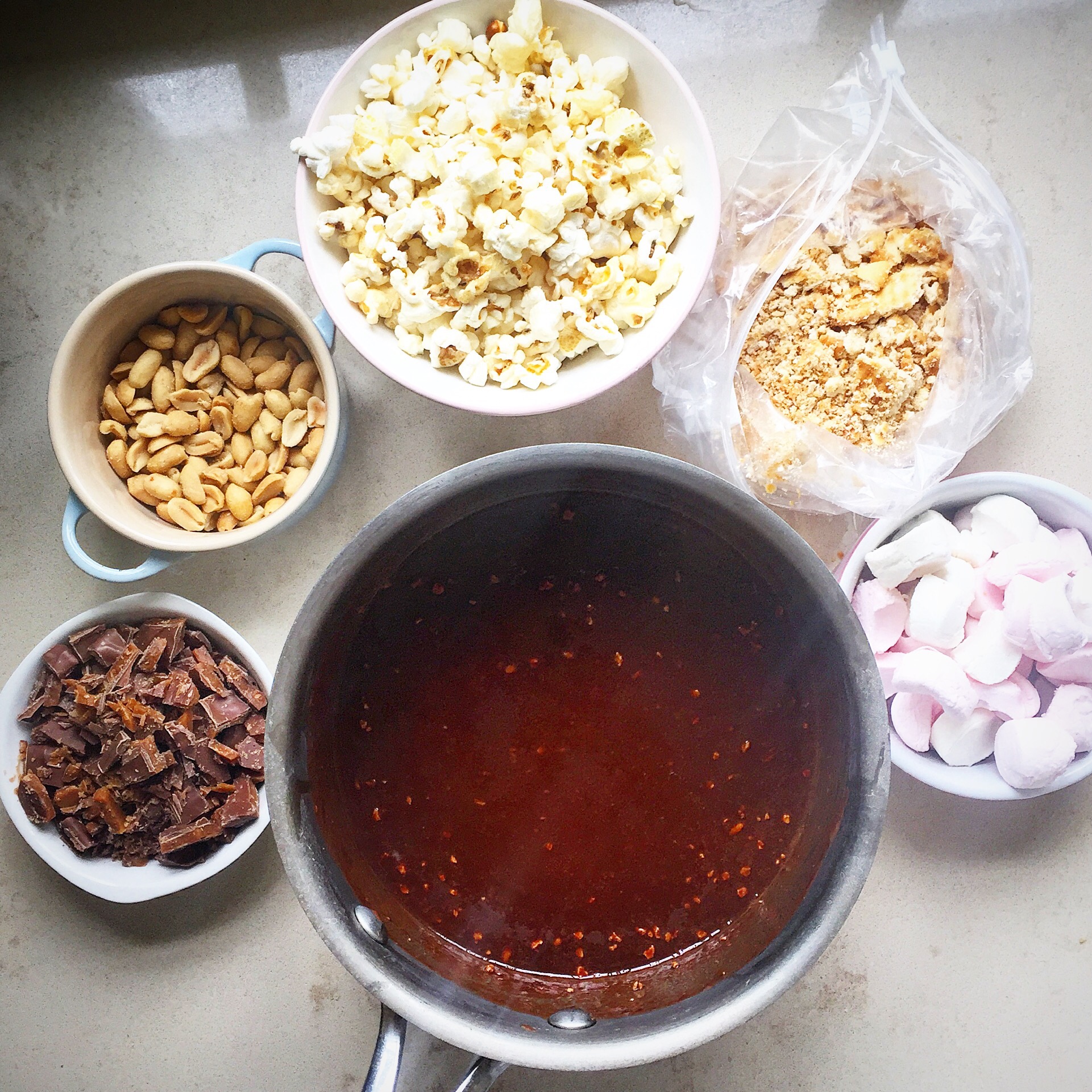 Tip your biscuits, popcorn, daim, marshmallows and nuts into a large bowl and pour on the melted chocolate mixture. Stir to coat everything evenly and then tip into the tin. Level off with a spatula and chill while you make the salted caramel.