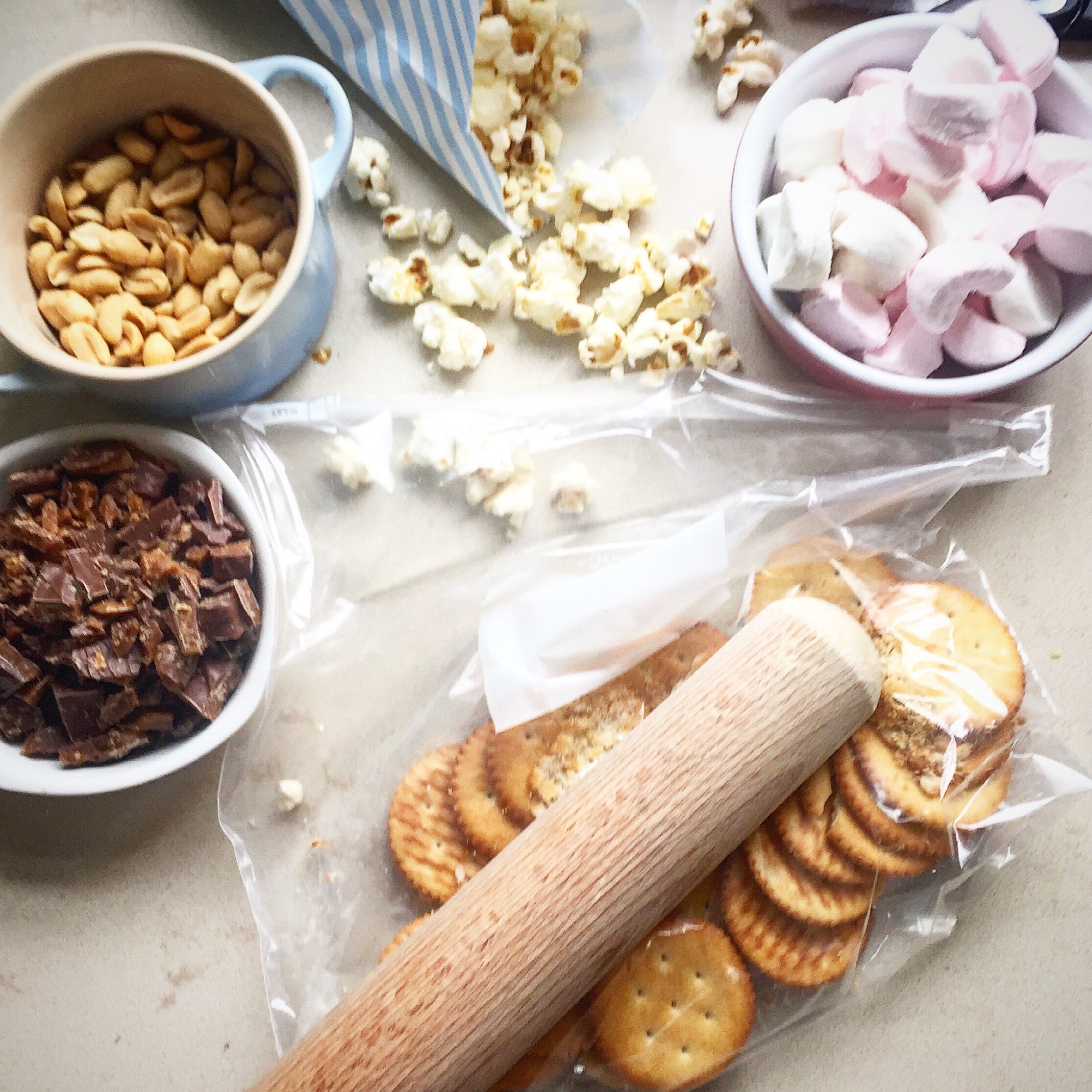 Put the crackers into a sandwich bag and seal, bash with a rolling pin to break into small chunks. Melt the chocolate, butter and golden syrup in a small pan, stirring occasionally until melted and smooth.