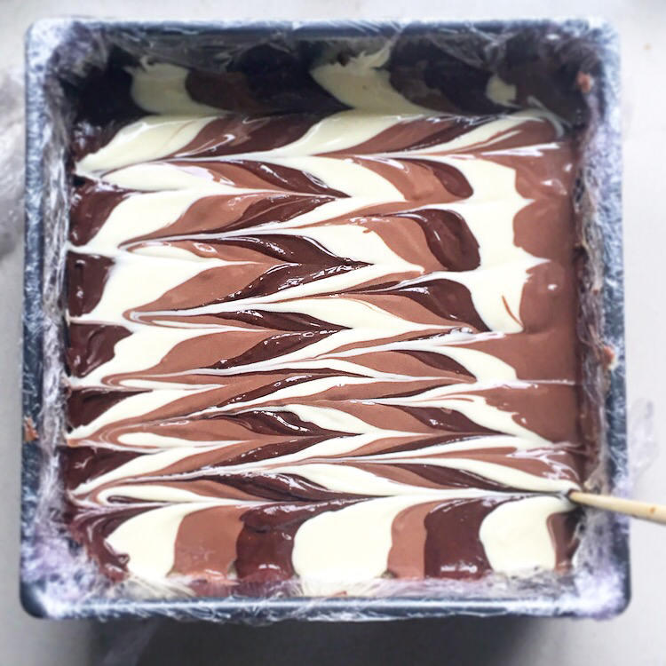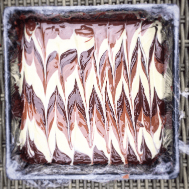 Melt each chocolate over a pan of barely simmering water, don’t stir until it’s almost fully melted or the chocolate could seize. Pour alternate lines lengthways down the cake, repeating each set until all the chocolate has been used up. Use a metal or wooden skewer to drag lines widthways and create a marble affect. (See video) Return to the fridge until completely set, about 4-6 hours or overnight. Cut into squares to serve, will keep in an airtight container in the fridge for about a week.