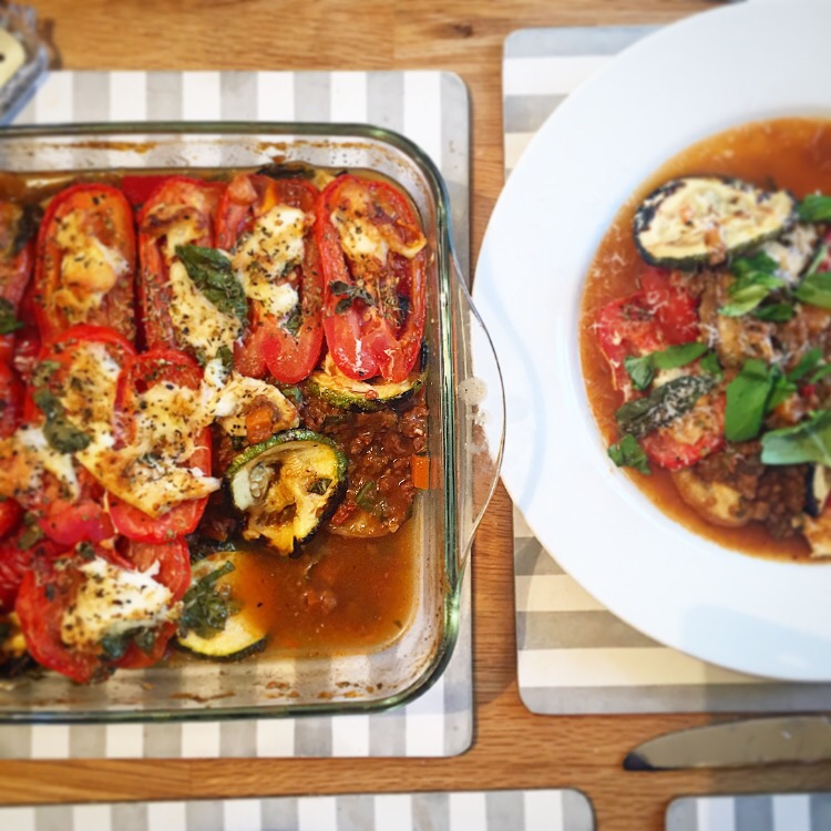 This post follows on from my recipe for slow cooked beef and vegetable ragu. It’s another delicious way to serve the ragu with even more lovely vegetables! It’s reminiscent of a lasagne al forno but it’s much lighter without the béchamel and layers of pasta. A healthier take on the dish that still feels quite comforting with the bubbling layer of stringy, melted mozzarella on top.