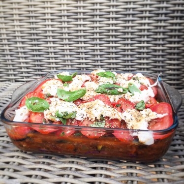 Assemble in a medium ovenproof dish, a layer of half the beef ragu, then some grilled vegetables, another layer of beef then the rest of the veg. Finish with the tomatoes, season with salt pepper and then add the torn mozzarella. Top with the rest of the basil and oregano and bake for 45 minutes, covering with foil if the cheese gets too brown, until golden, melted and bubbling. Leave to stand for 10 minutes before serving.