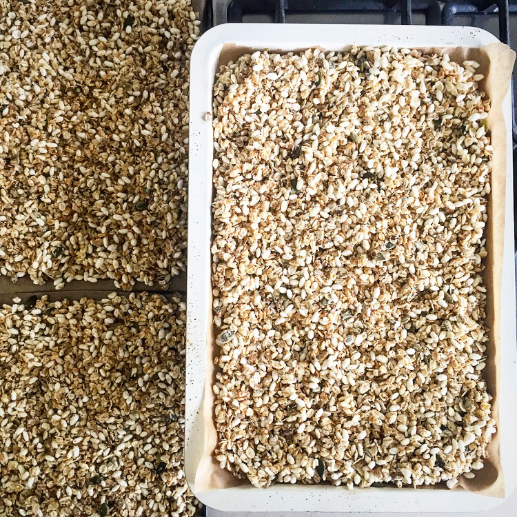 Heat oven to 200C/180C fan/gas 6. Put the coconut oil, maple syrup, agave and vanilla into a saucepan with the apple juice, bring to the boil and then simmer for 10 minutes. Tip the whole grains, seeds, nuts and puffed rice into a large bowl then pour on the liquid and quickly toss to mix together so everything is evenly coate