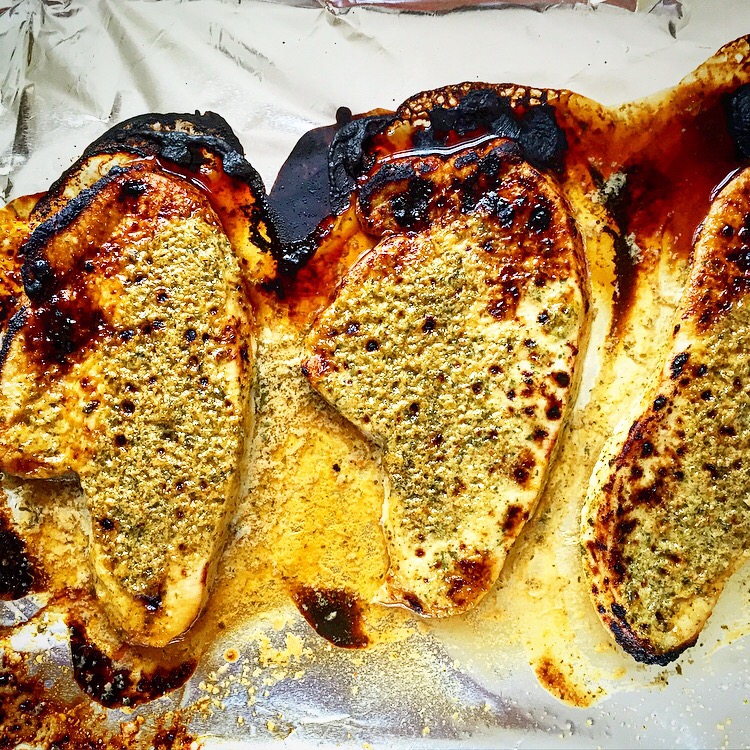 Heat the grill to it’s highest setting. Lift the turkey from the marinade onto a baking tray lined with foil. You want the grill to be scorchingly hot before you start cooking and the turkey to be as close as possible underneath as you want the marinade to caramalise without the turkey getting dry. For this reason as they are so think we’re just going to cook on one side for 4-6 minues until you have a really good colour. Remove and rest for 5 minutes before slicing into strips.