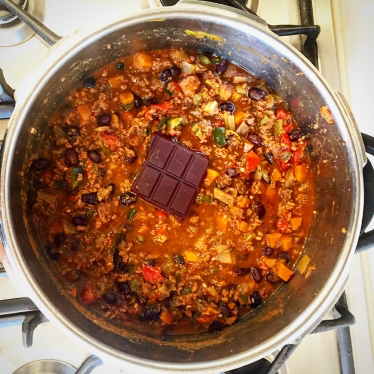 Pressure cooker: Once boiling put the lid on and lock, wait until it comes up to high pressure then turn down to the lowest heat and time 40 minutes, slowly reduce the pressure and then stir well, simmer for a few minutes uncovered if the mixture needs to thicken. Stir in the beans and chocolate. Allow to cool slightly before tasting and seasoning with black pepper and salt if it needs it.