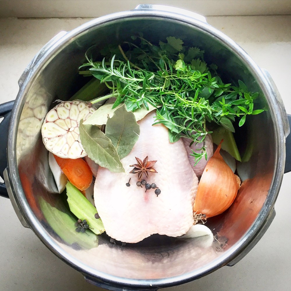 Put all the broth ingredients, along with a good pinch of salt, in a large pan. Cover with cold water, about 2-3 litres. If you have a pressure cooker, use this, it will take 20 mins on high pressure, then release slowly. If you don’t have one, get one. No, just joking, bring up to a simmer, then cover and simmer gently for about 1hr 45 mins, until cooked through, adjusting the time if your chicken is slightly smaller or larger.