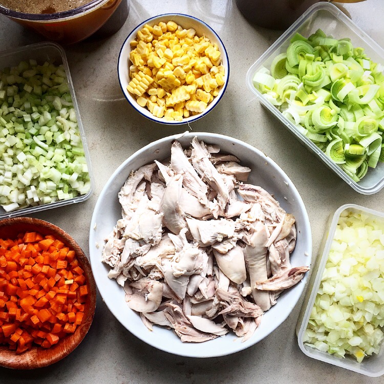 Remove the chicken and allow to cool slightly. Strain the stock using a gravy strainer that separates the fat into a couple of jugs or a big bowl, throw away the fat. if you don’t have a strainer it’s easiest if you let it cool to room temp then get it into the fridge so the fat can solidify and you can remove it all. I do this the day before and leave it overnight. It means you can literally just spoon of the layer of solidified white fat, leaving you with a crystal clear, jelly like chicken broth that’s virtually fat free and full of chicken flavour. If you try and get the fat off before, you’ll lose loads of the broth, and that isn’t a good thing. Remove the skin and bones from the chicken and shred the meat. Set aside in the fridge until ready to make the soup.
