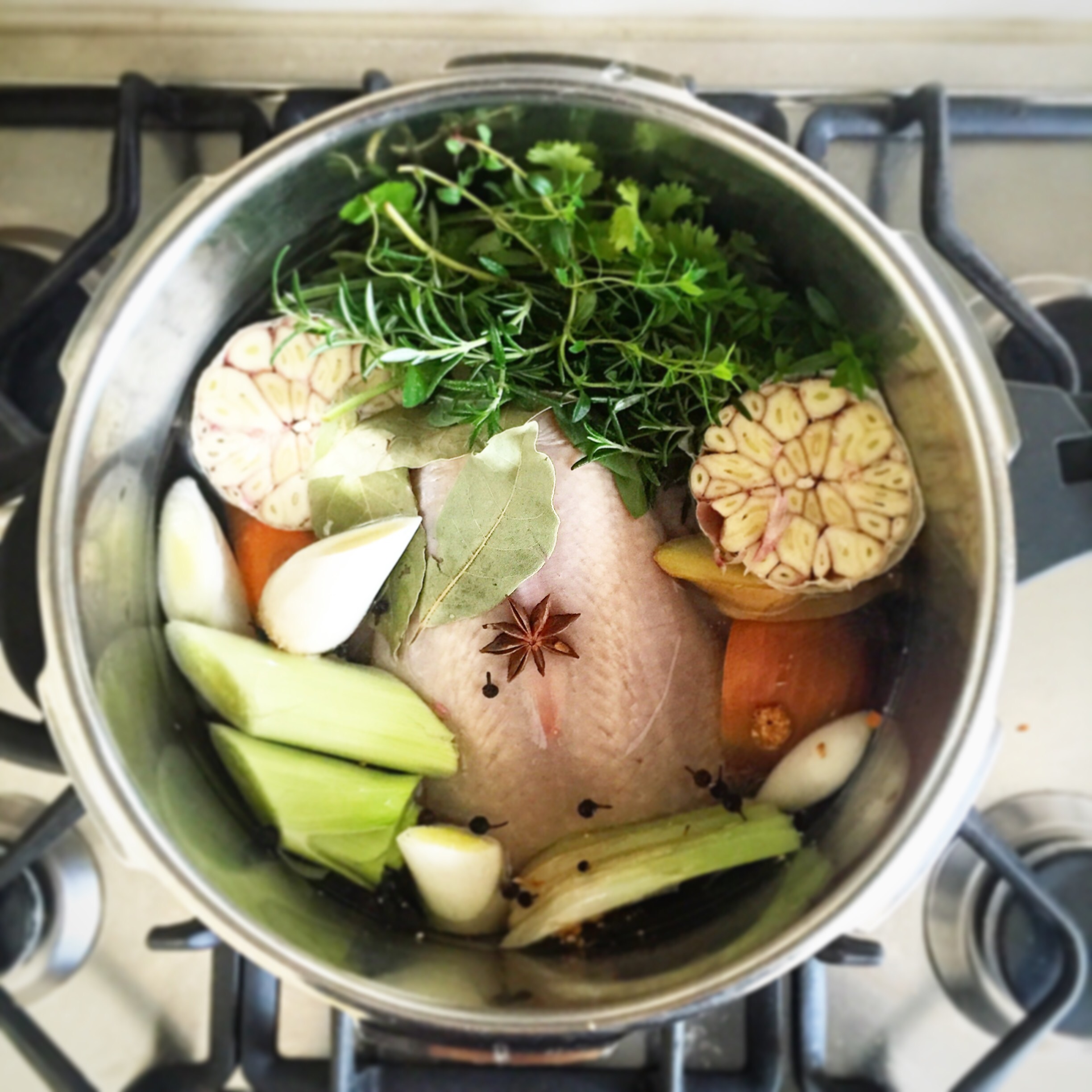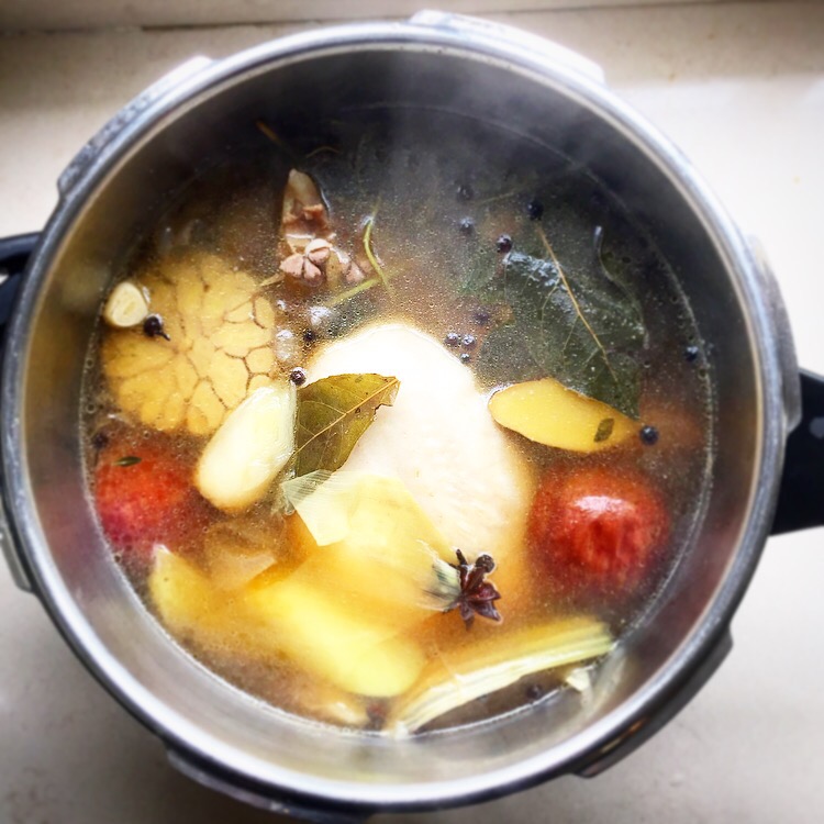 Put all the broth ingredients, along with a good pinch of salt, in a large pan. Cover with cold water, about 2-3 litres. If you have a pressure cooker, use this, it will take 20 mins on high pressure, then release slowly. If you don’t have one, get one. No, just joking, bring up to a simmer, then cover and simmer gently for about 1hr 45 mins, until cooked through, adjusting the time if your chicken is slightly smaller or larger.
