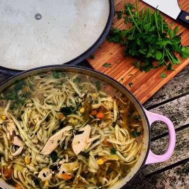 Put your veg apart from the corn and a little splash of stock into a large pan and cook on a medium heat, stirring occasionally, until soft about 10-15 mins. Tip in the stock and bring up to a gentle boil. Add the chicken, corn, noodles and most of the parsley, season, It will need a good amount of salt and pepper here, so keep tasting and adjusting till the flavour is good. Simmer until the noodles or pasta are cooked to you liking. Turn off the heat but leave on the hob with the lid on for 10 mins. The noodles will soak & soften and the soup will cool from mouth burningly boiling to edible.