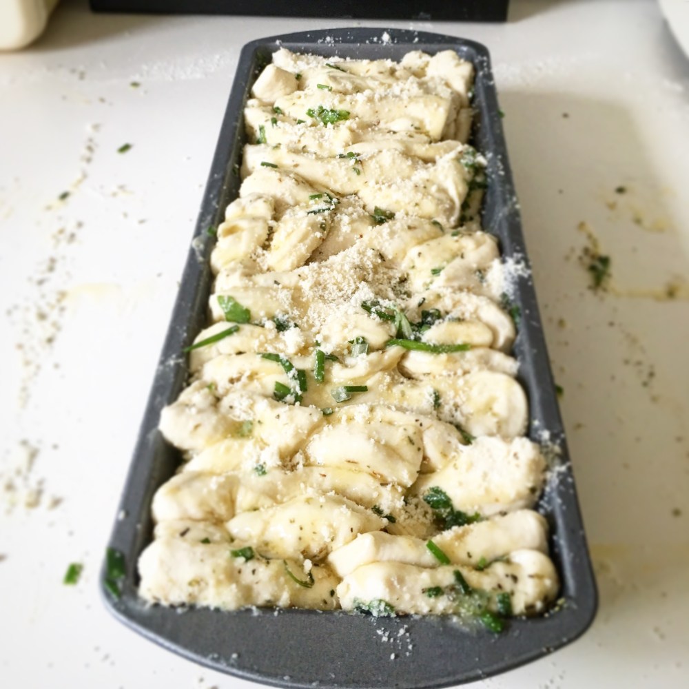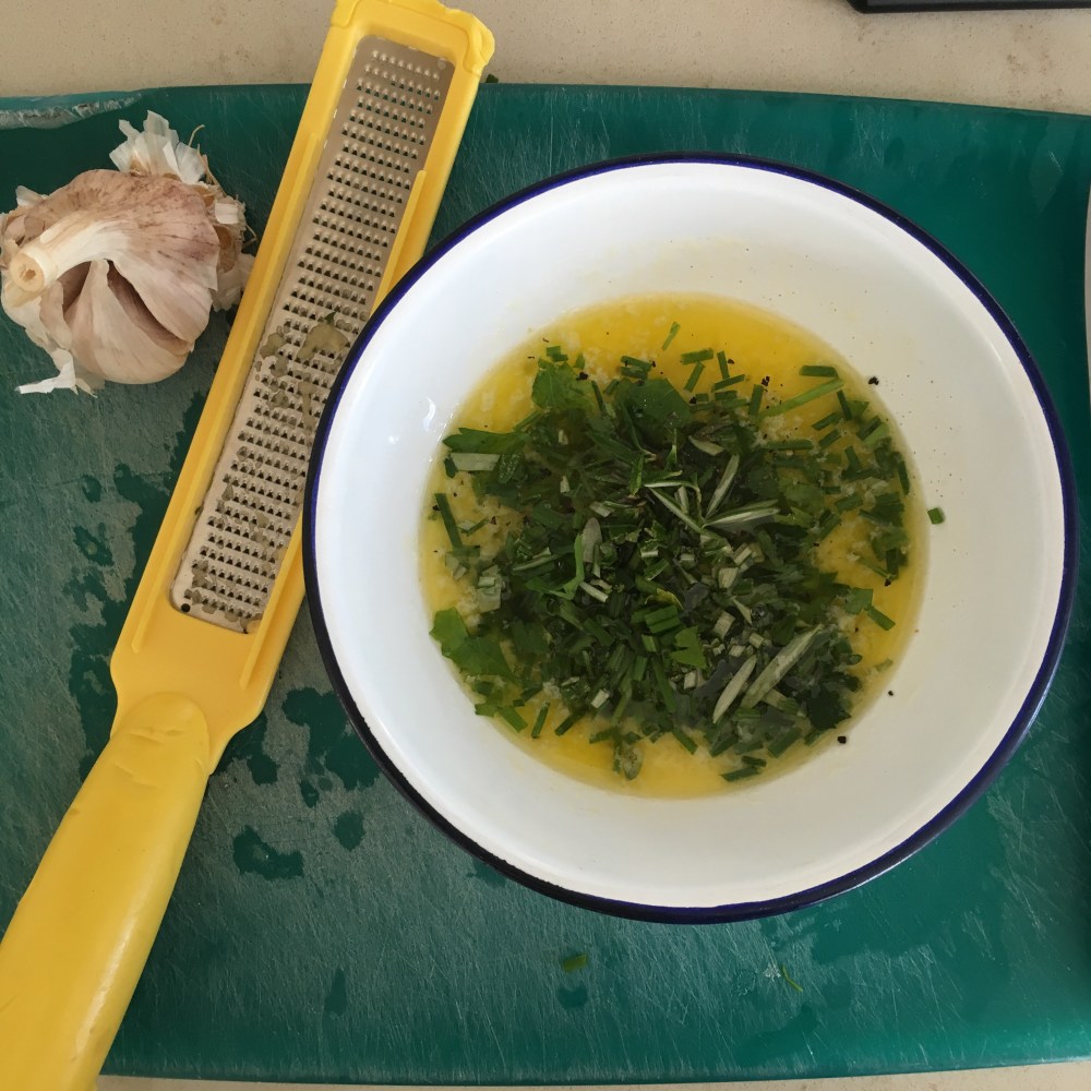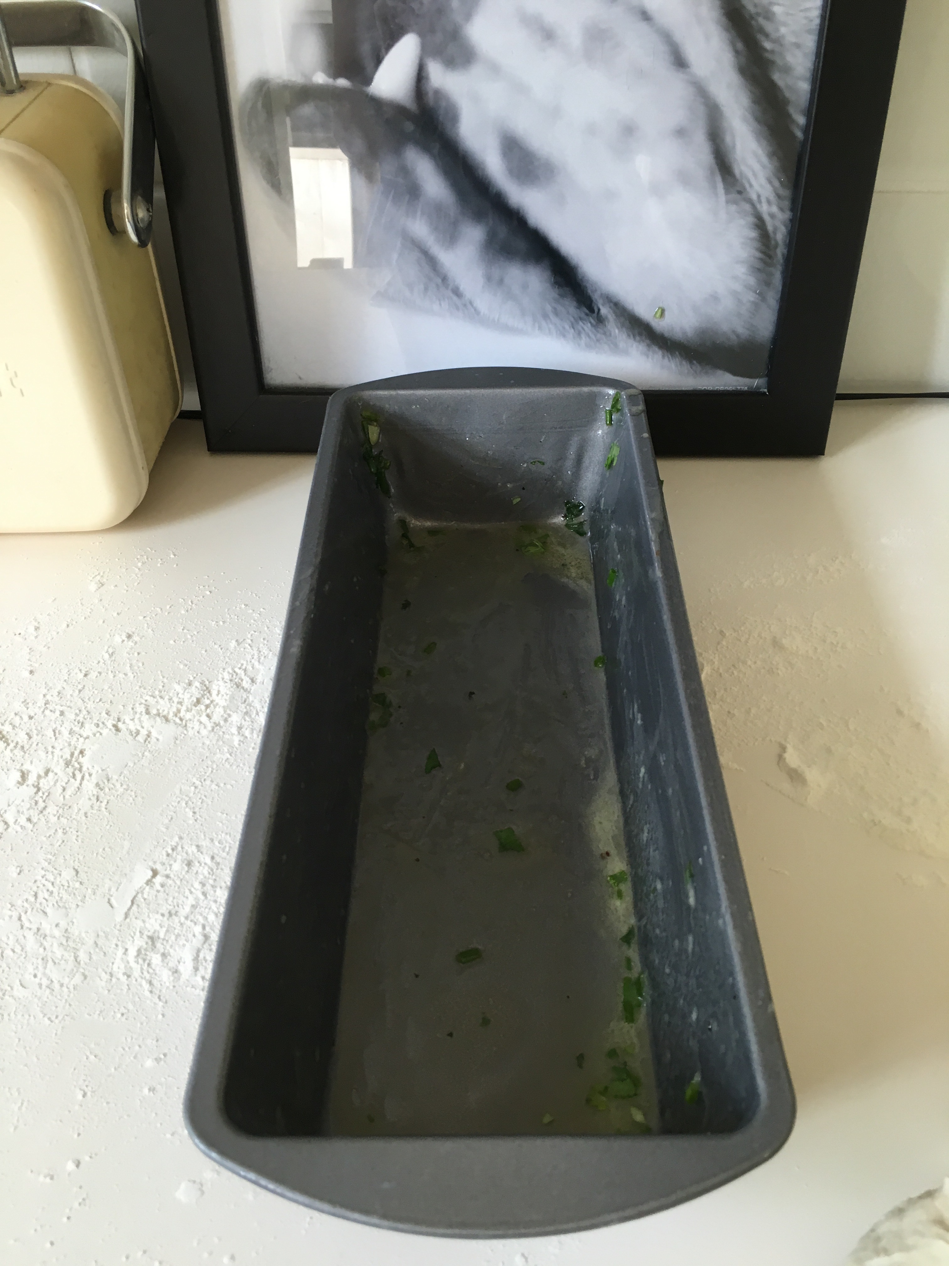 Melt the butter and mix with the crushed garlic, herbs and some salt and pepper. Brush a 2lb loaf tin (this size) (or use two smaller loaf tins if you don’t have one) generously with the some of the melted butter.