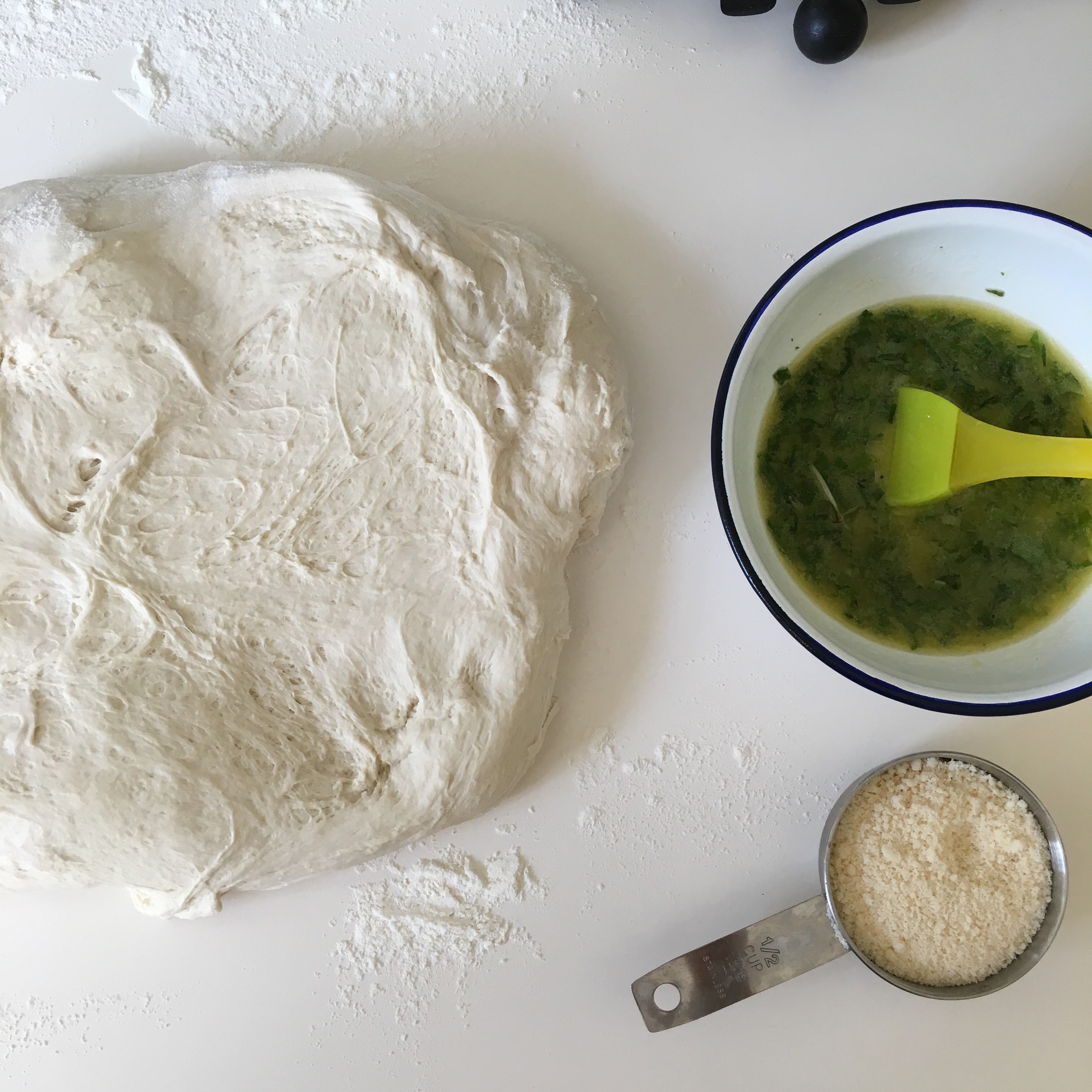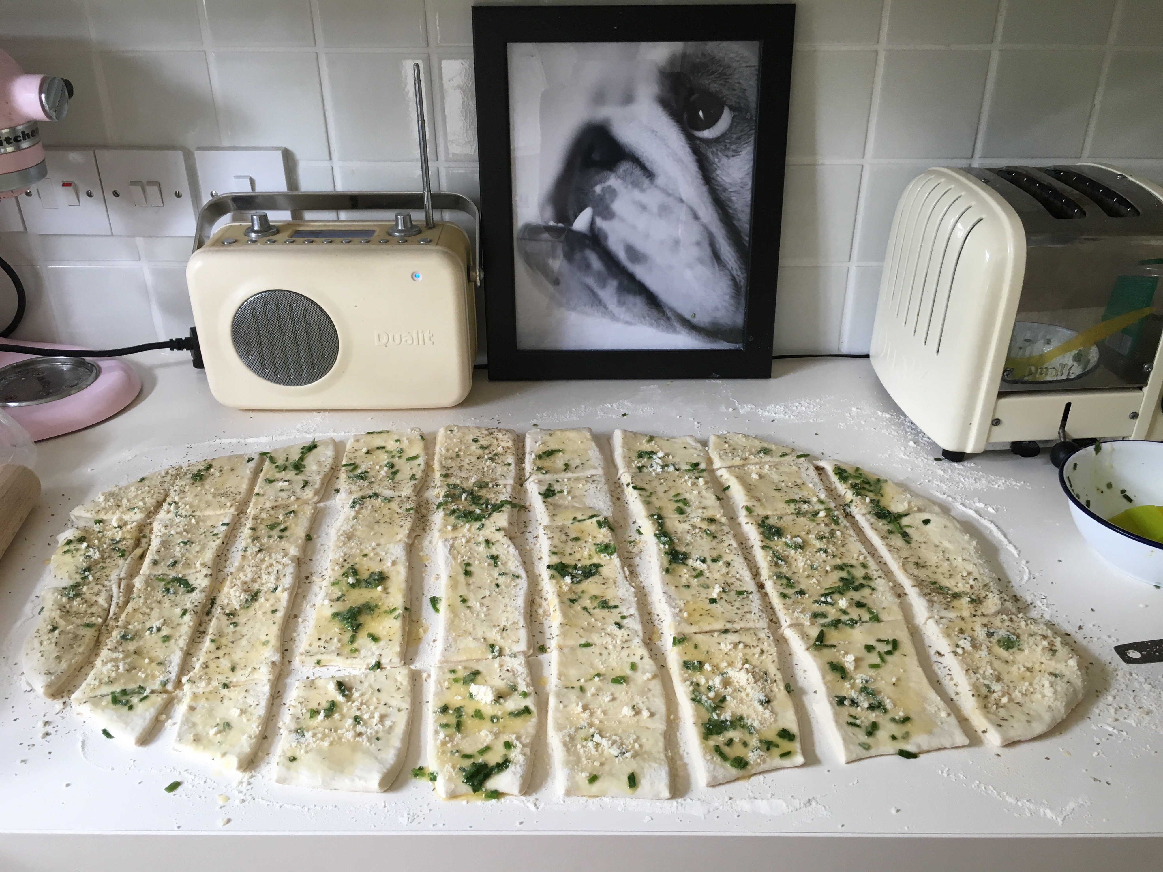 Gently knock the dough back with your fist and then tip out onto a lightly floured surface. Flatten out with your hands on a lightly floured surface until you have a large oval of dough. Now use your rolling pin too roll the dough into a large rectangle, about 50cm x 30cm. Cut using across 5 times and down 4 times with a pizza cutter so that you have 20 even squares. Brush with the garlic & herb butter then scatter on the oregano, garlic granules and the cheese.