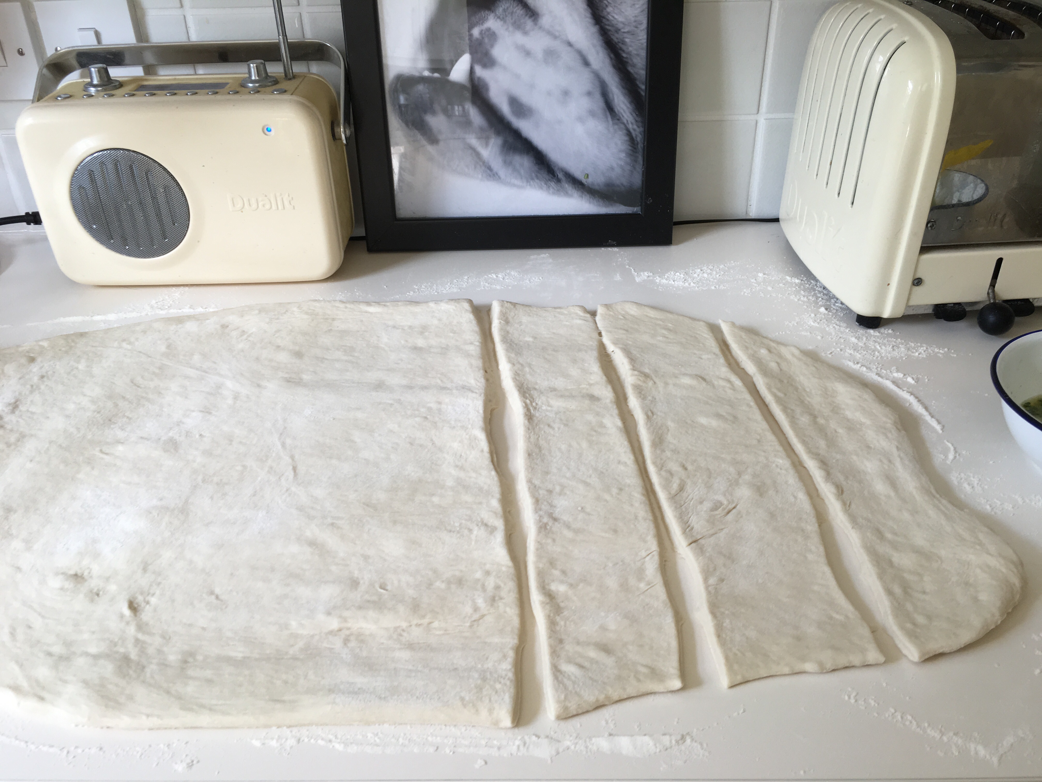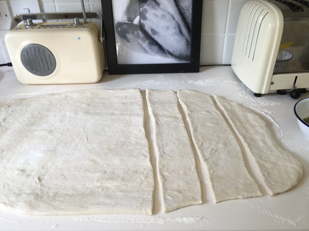 Put the tin on its side and stack up the rectangles on top of each in the tin. Once filled turn back to the right side up, cover loosely with oiled cling film and leave until doubled in size, about an hour. Meanwhile heat oven to 200C/180C fan/gas 6.