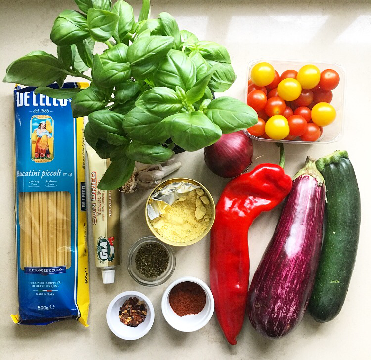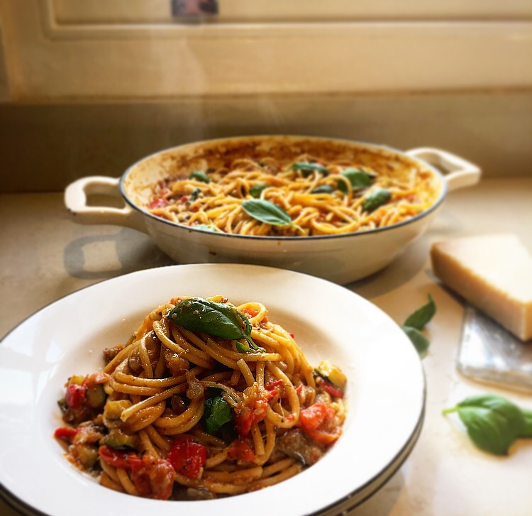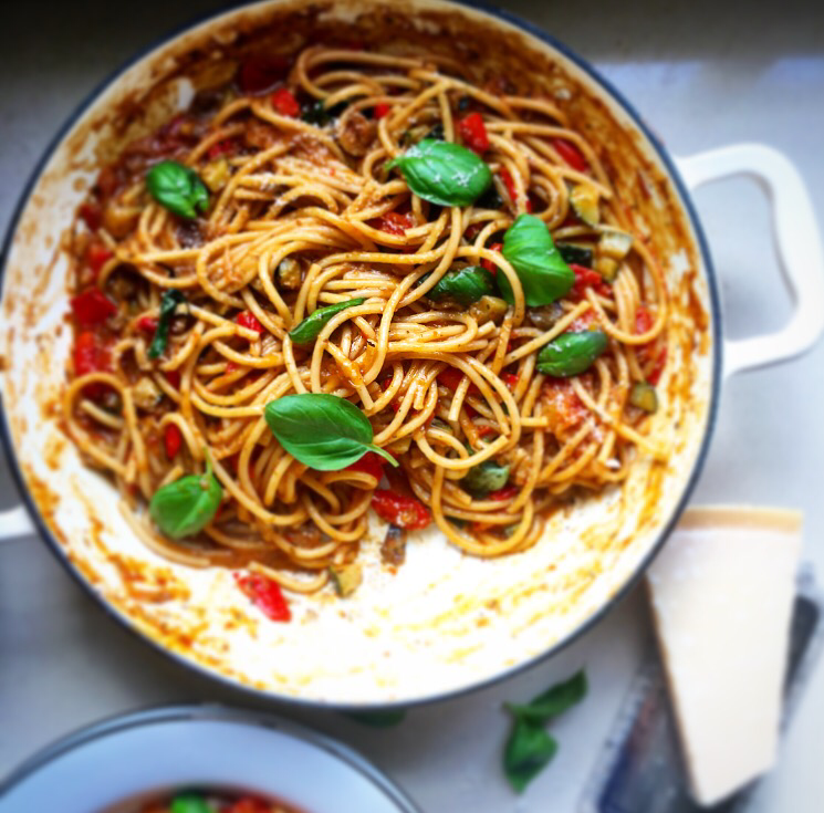 This is a great recipe; its all cooked in one pan, there’s hardly any washing up, it’s simple, healthy and has lots of lovely veggies in plus it’s ready in less than 30 minutes. You can pick up the ingredients for about a fiver, depending on where you shop, and just add a few store-cupboard staples and you’ve got a meal for four people. We usually have it as a dinner for two and then have the leftovers for lunch the next day, pasta really does get tastier once it’s sat for a while as all the flavours soak in, in fact my husband actually prefers it the day after. This base recipe is really versatile too, add diced chorizo or bacon for a meaty version or vary the vegetables based on what you have in the fridge.