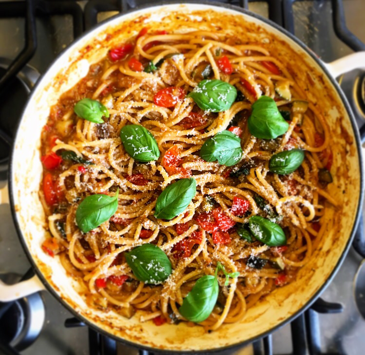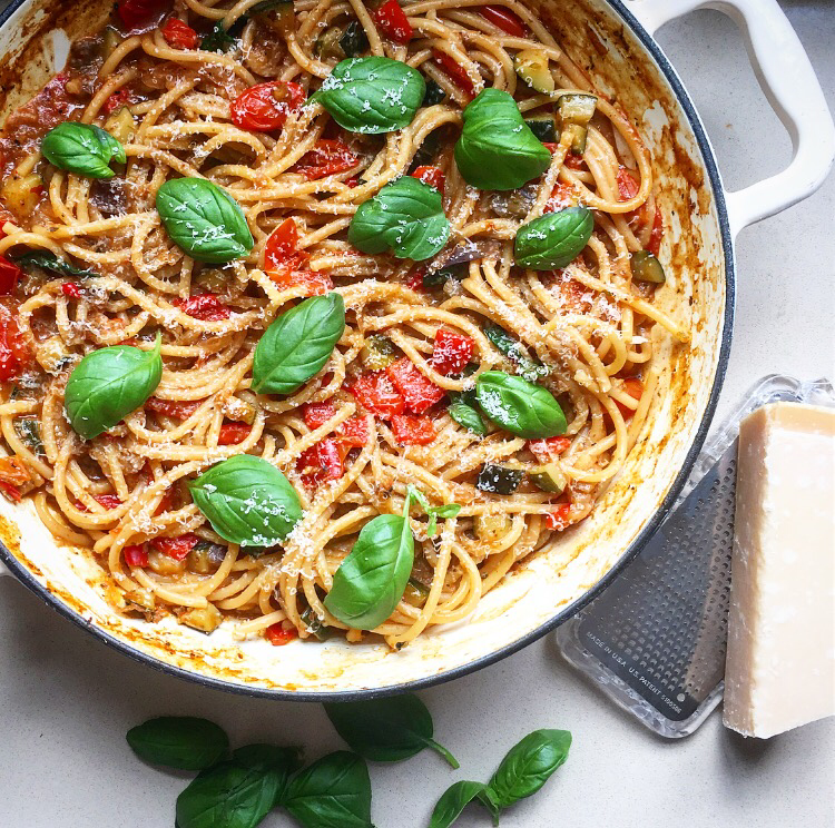 Bring up to the boil, helping the pasta to fully submerge. Once the pasta is covered and the liquid is bubbling simmer gently for the time stated on the pasta packet, stirring occasionally with tongs, until the liquid has been absorbed and the sauce coats the pasta. Test a strand; you may need to cook for 2-3 mins more, depending on the brand and how you like it cooked. Grate over about 3 tbsp of Parmesan and add a handful of basil and stir it well, divide into 4 bowls. Serve with more grated Parmesan and fresh basil on top.