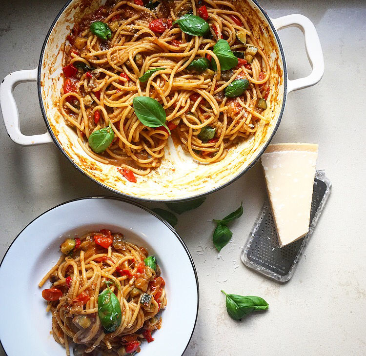 Make the vegetable bullion up to 1.2 litres with boiling water. Heat the oil in a large, deep frying pan and fry the garlic, aubergine, courgette and pepper with a pinch of salt on a medium heat for 5-8 minutes, until softened, stirring often. Add everything else to the pan (apart from the Parmesan and basil) and pour over the stock.