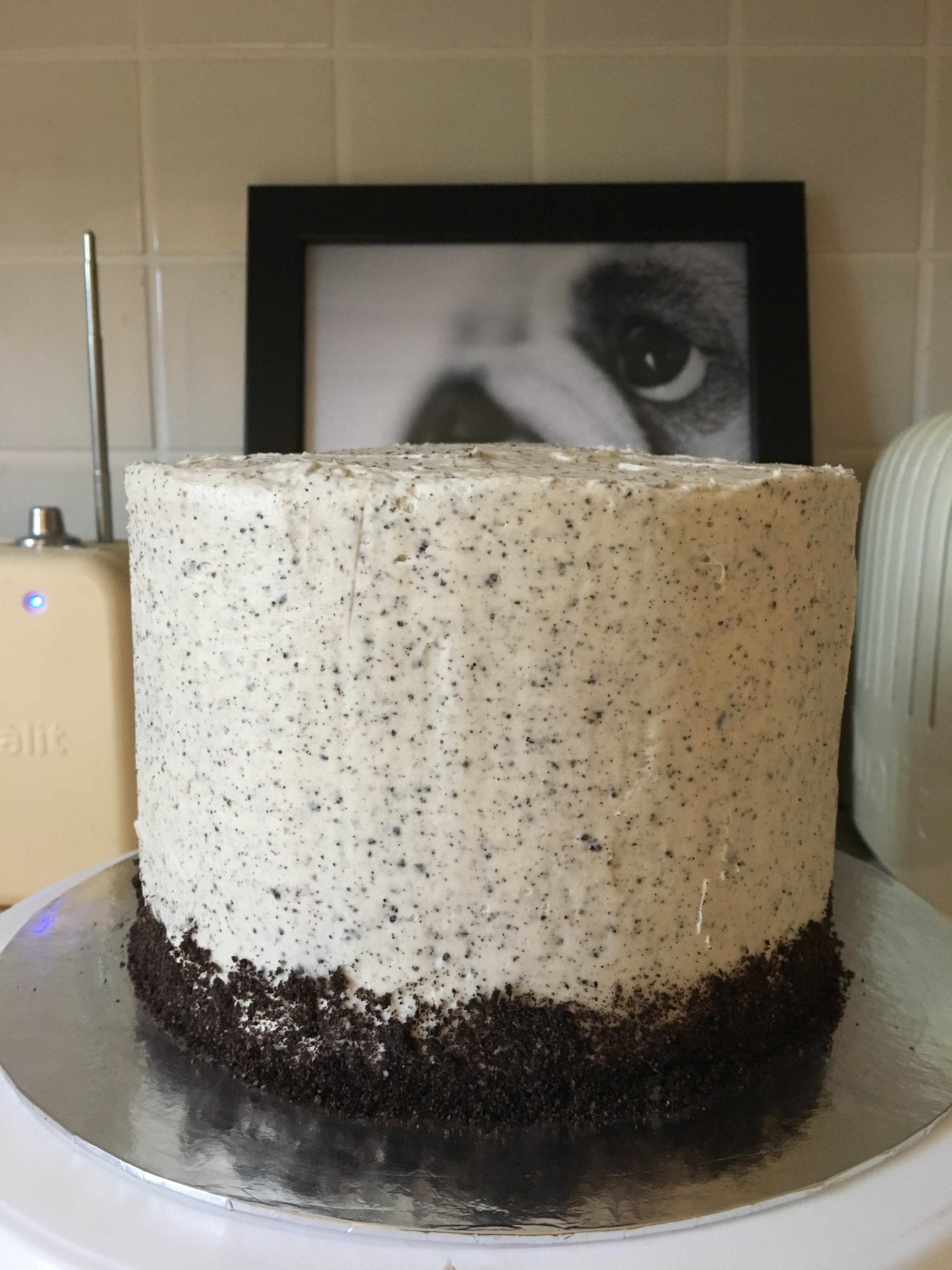Once the icing is chilled, use the remaining icing to completely cover the cake. This is easiest if you pile the icing on top of the cake, then use a palette knife to ease it over the edge and down the sides. Use a cutlery knife to decorate the bottom of the cake with the reserved Oreo crumbs, brushing off any excess. Chill for another 30 minutes.