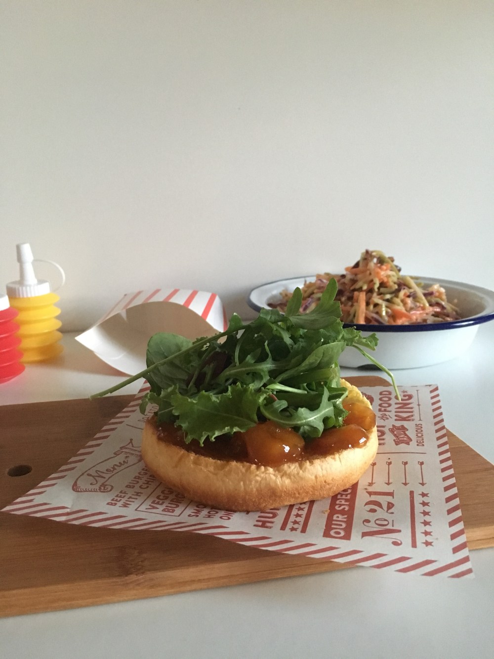 Spread one side of the toasted buns with the garlic mayo and the other with mango chutney. Add a handful of leaves to each base then add a turkey steak, slice of bacon then top with the bun lid. Serve with the chips and slaw.