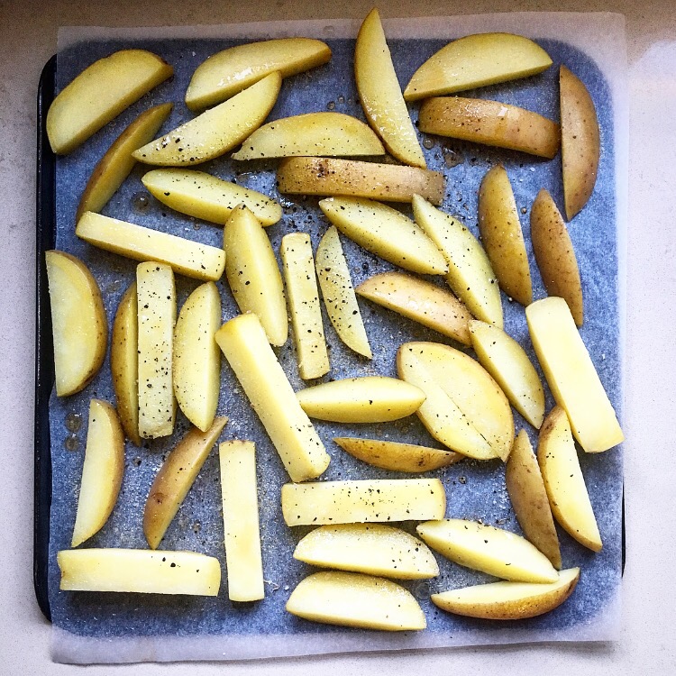 You can swap the potatoes for sweet potatoes if you like, just skip the boiling part or they will take on too much water. I use regular potatoes because for me sweet potato fries have to have a crunch, and this only comes from deep-frying. However I love these oven-baked chips and I don’t feel like I’m missing out at all!
