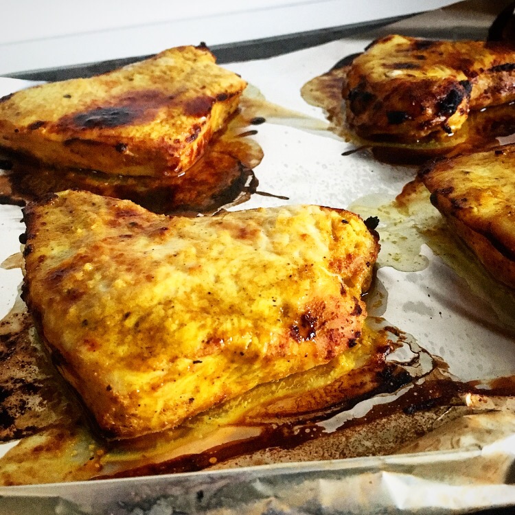 Meanwhile combine the yogurt or buttermilk with the turmeric and curry powder and some seasoning in a medium plastic food bag (or bowl). Add the turkey steaks and use your hands to massage and coat in the marinade, there’s not loads of marinade but there is enough to coat if you mix well. If you have time do this the night before to add more flavour. Transfer to a foil lined tray with the bacon.