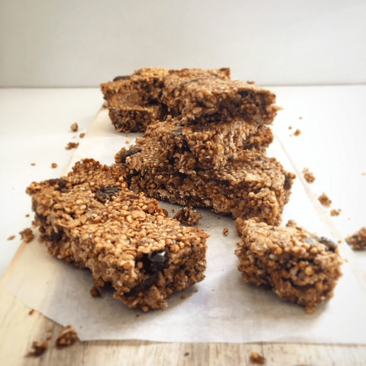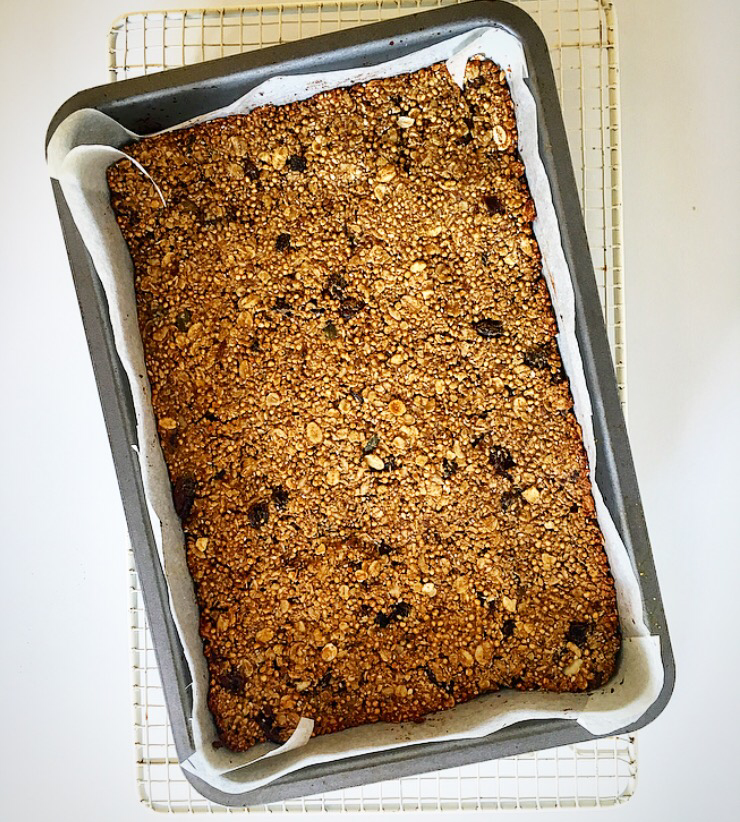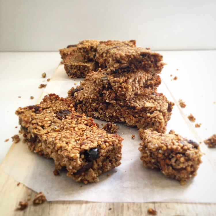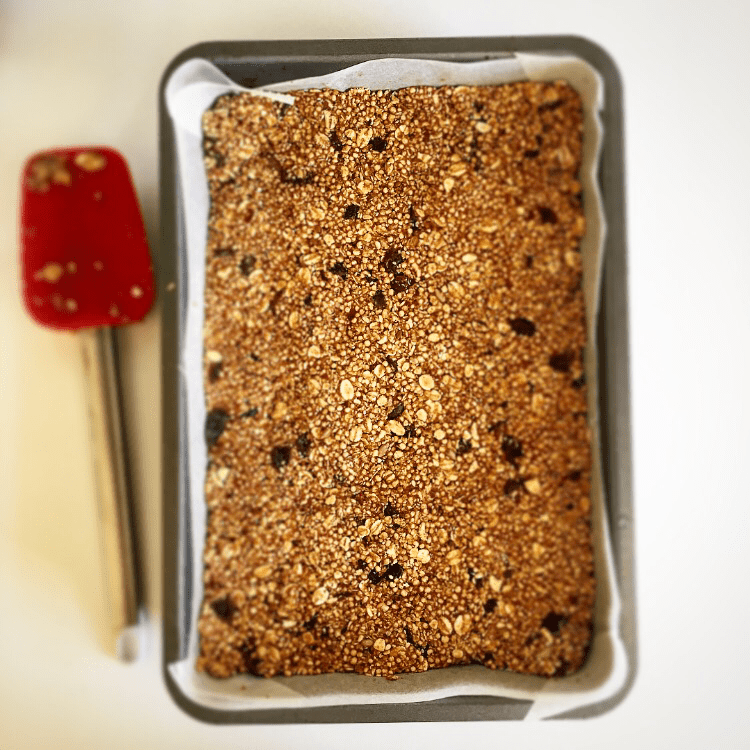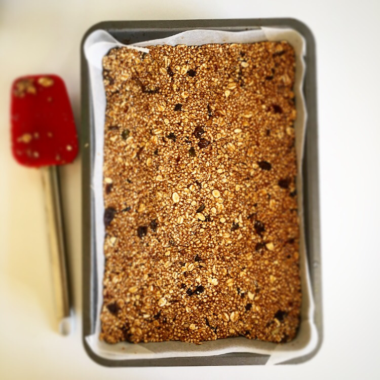 We certainly don’t want to be relying on the kinds of foods in that ingredients list as our main source of fuel. So here’s a recipe with just a handful of ingredients. Ingredients you understand and trust, that you’re happy to put into your body. The bars are sweetened with dates, a natural source of sugar, and they’re crammed full of healthy oats, quinoa and lovely dried fruit and nut butter. I’ve used coconut oil as the fat because it’s literally jam packed with health benefits, it seems like there’s nothing it can’t do. If Trump falls flat I’m pretty sure coconut oil could happily take his place….