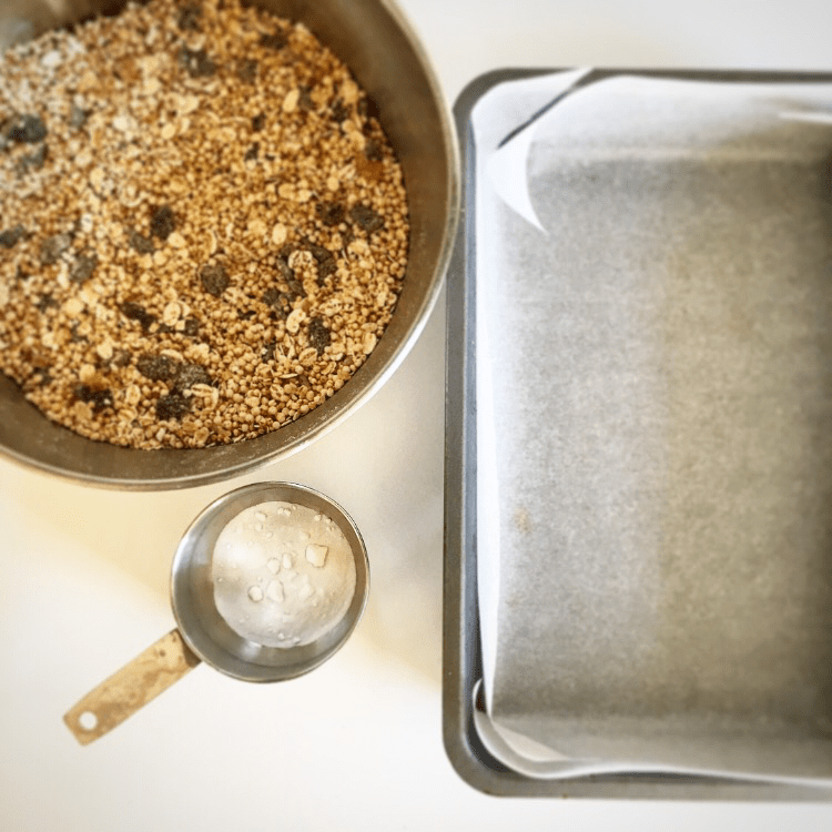 Tip the dry ingredients into a large bowl with a pinch of sea salt. Mix the bicarb with 1 tbsp boiling water and add to the date paste then quickly pour into the dry ingredients and mix until everything is coated. This will be a bit of an arm workout and it may seem like there isn’t enough paste to coat but if you keep working using a big spatula it eventually all gets coated.