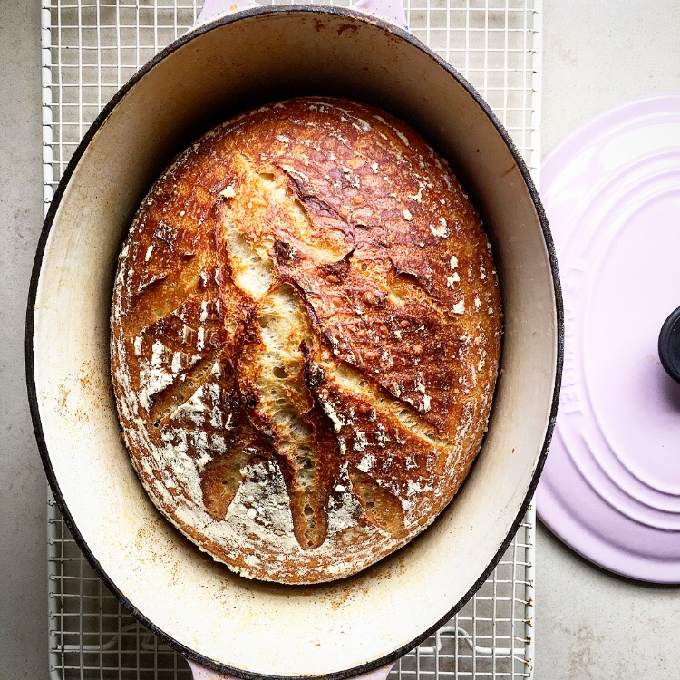 You’re now ready to bake your loaf and you have two options here 1) in a cast Iron pan with a lid, such as a le crustet. 2) on a standard baking tray spraying the oven with water. The first method will give you a thicker crust but if you don’t have a cast iron pan then the second is definitely good enough! Personally if this is your first time I would be going for option 2 as it’s easier to release the loaf onto a tray than into a very hot pan!