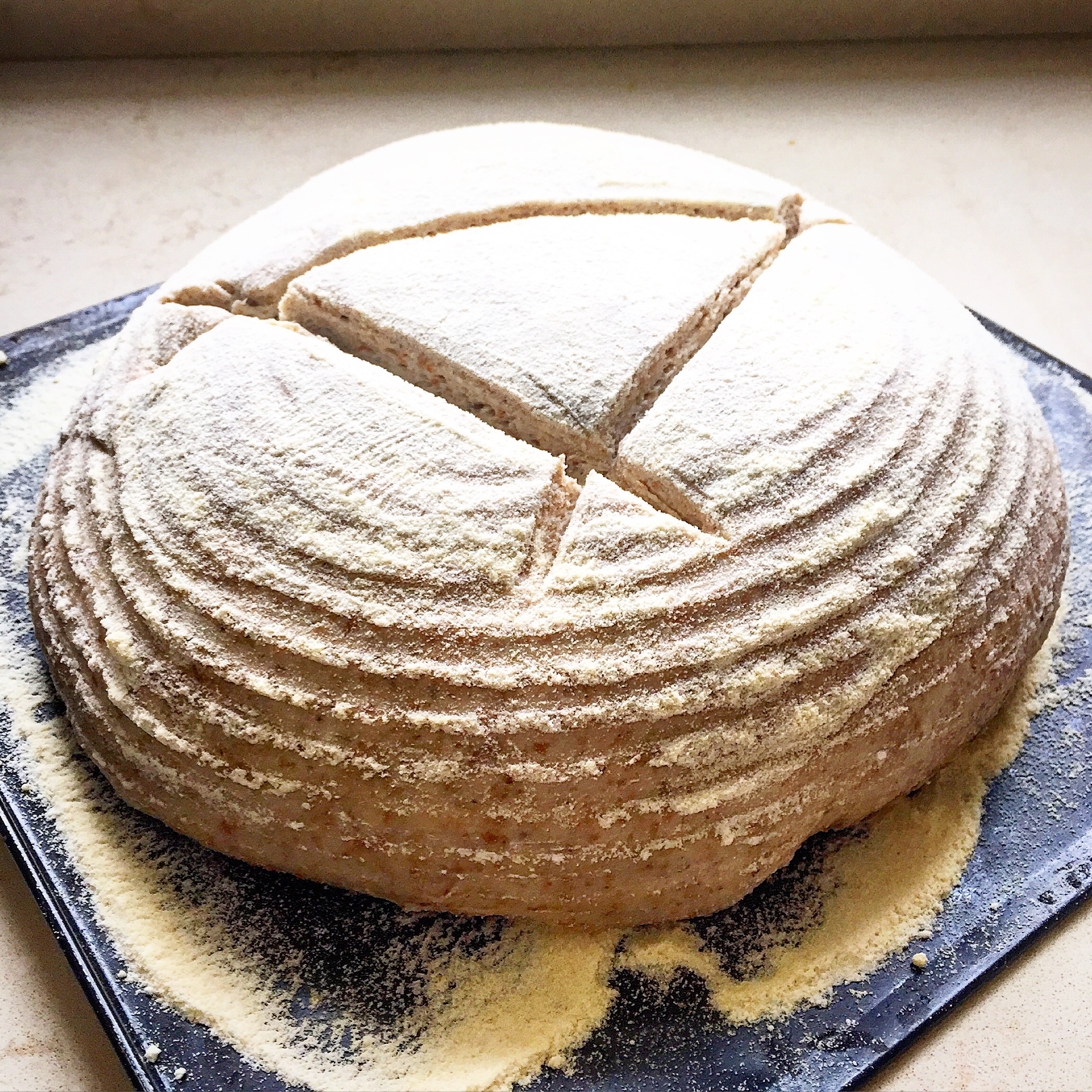 Firstly dust your basket really well with 2 tbsp of ground rice flour (or regular flour if you can’t find this). Make sure it is really well floured all over or your bread will stick. Believe me I speak from experience.