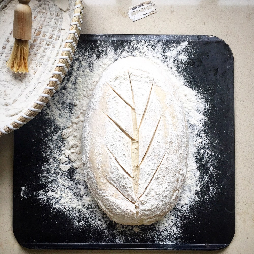 Heat oven to 240C/220C fan/gas 8. Take a tray and dust all over with semolina flour. Take your basket and invert onto the tray. Give the basket a firm tap on top then gently shake from side to side, you’ll hear it release. Carefully remove the basket. Using a blade or a very sharp knife make a slash. You can do this in any pattern you like, see pictures for ideas. It allows the steam to escape in a controlled way.