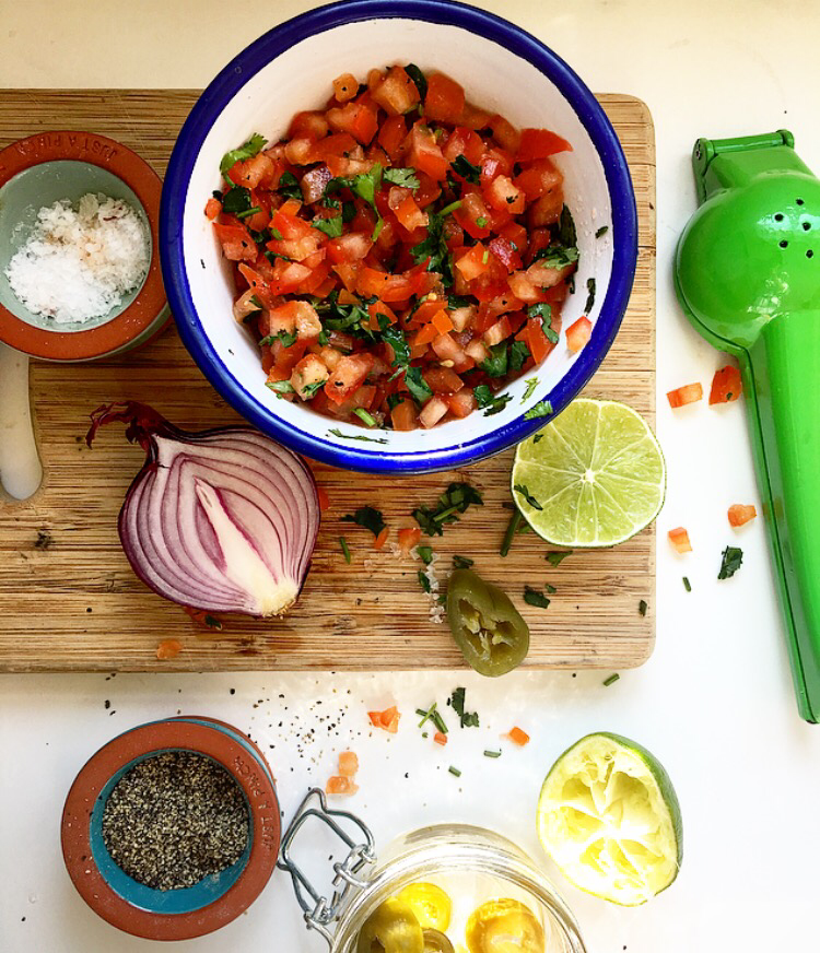 Dice the tomatoes as fine as you can and mix with the red onion, lime and coriander, then some salt and pepper. Taste and add a little more lime, salt or pepper if you need to. The flavour of this will improve the longer it’s left so if you can make it a few hours before, just leave it covered on the side, not in the fridge.