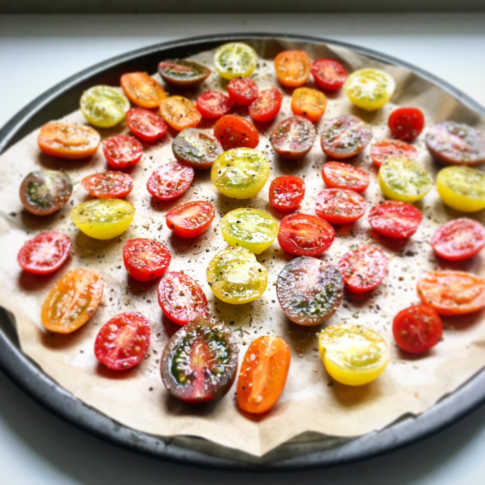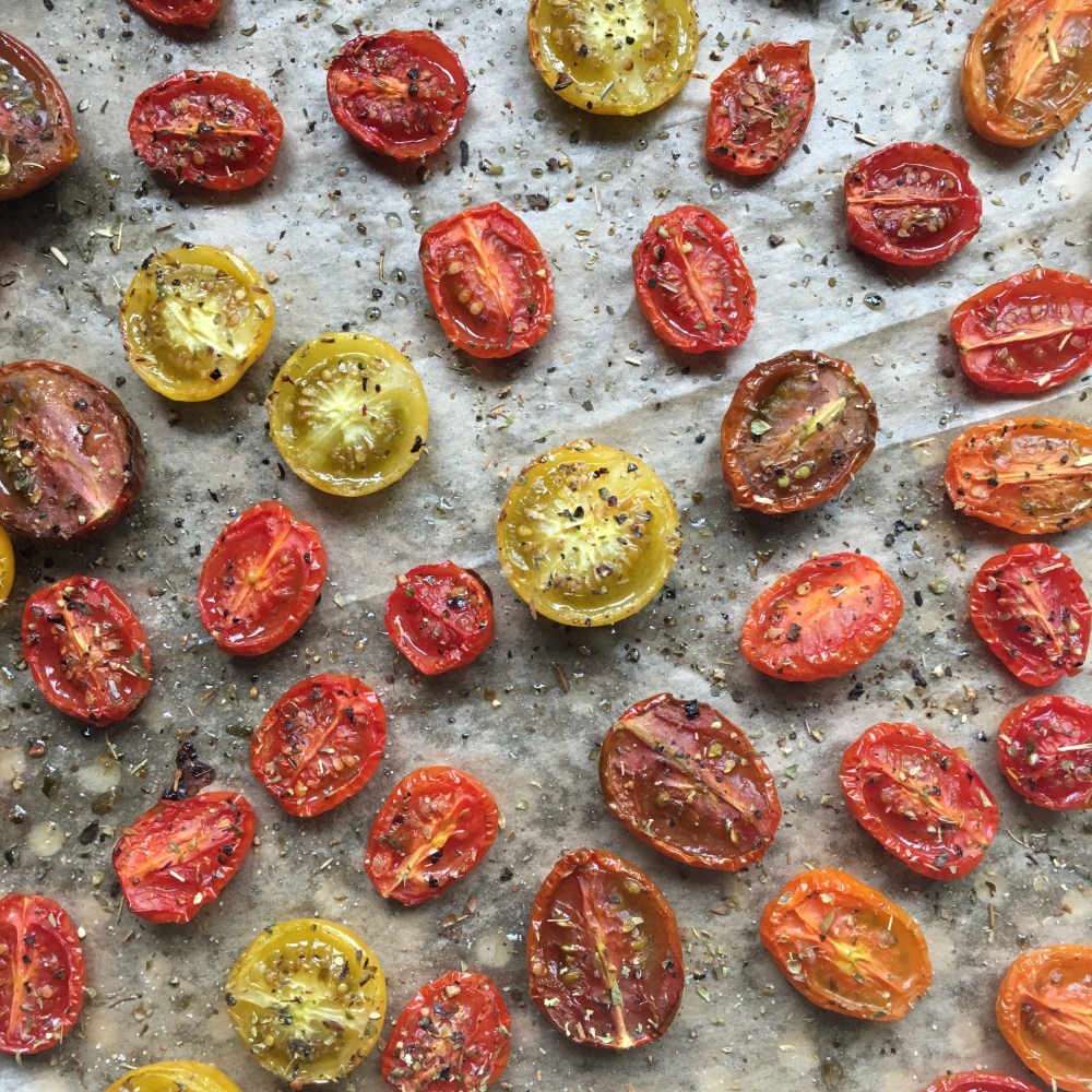 Heat the oven to 180C/160C fan/gas 6. Put the tomatoes, cut side up, on a baking tray lined with parchment. Season with salt and pepper and sprinkle with oregano and roast for 25 minutes. Set aside once cooked.