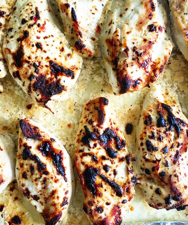 The recipe today is for this delicious salad that still feels like a treat for dinner, as it’s full of yummy ingredients like really tender marinated chicken, halloumi & roasted tomatoes. If you’ve not used it before you’ll find the buttermilk with the milk or cream in the supermarket. It’s a great ingredient to have for cooking as it’s low in fat but helps to create this creamy dressing plus it’s amazing for marinating!