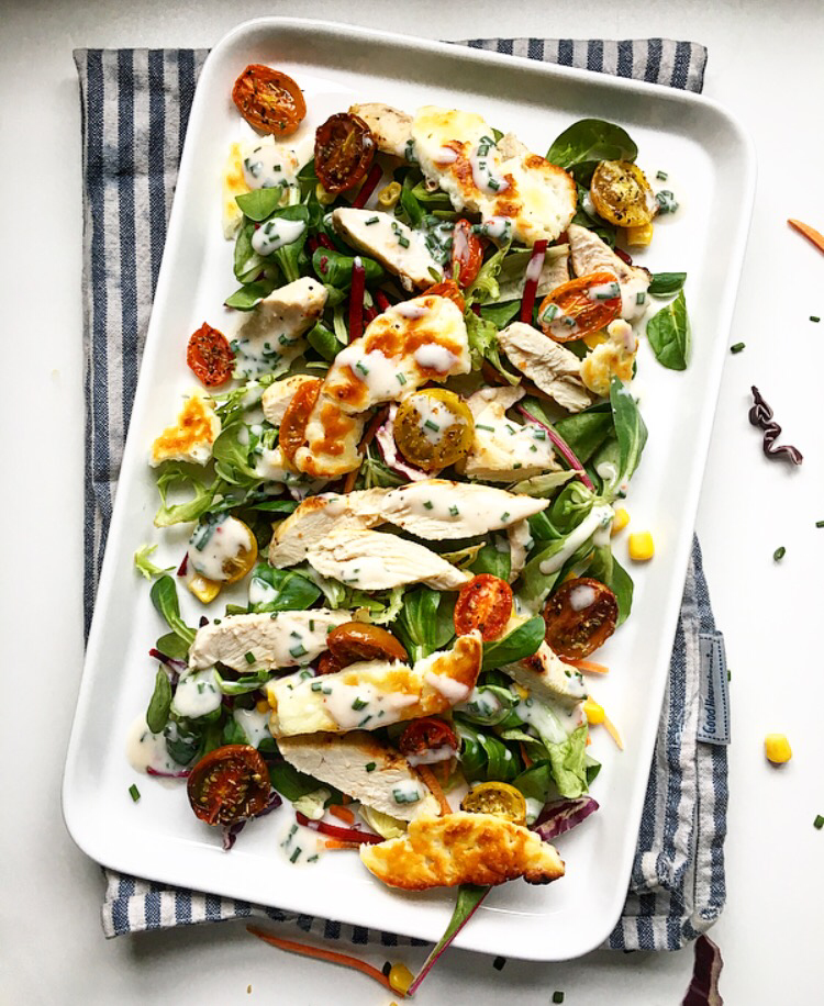 Chicken, Tomato & Halloumi Salad with Chive & Buttermilk Dressing.