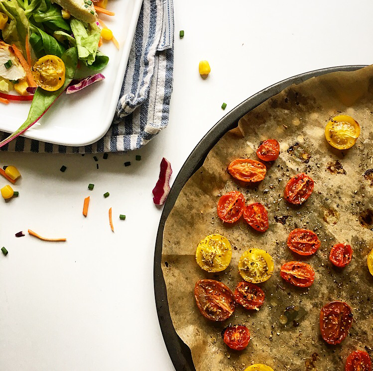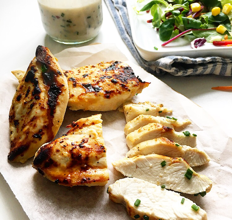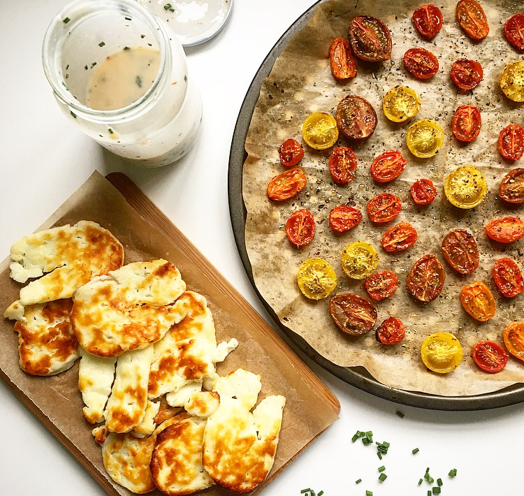 The recipe today is for this delicious salad that still feels like a treat for dinner, as it’s full of yummy ingredients like really tender marinated chicken, halloumi & roasted tomatoes. If you’ve not used it before you’ll find the buttermilk with the milk or cream in the supermarket. It’s a great ingredient to have for cooking as it’s low in fat but helps to create this creamy dressing plus it’s amazing for marinating!
