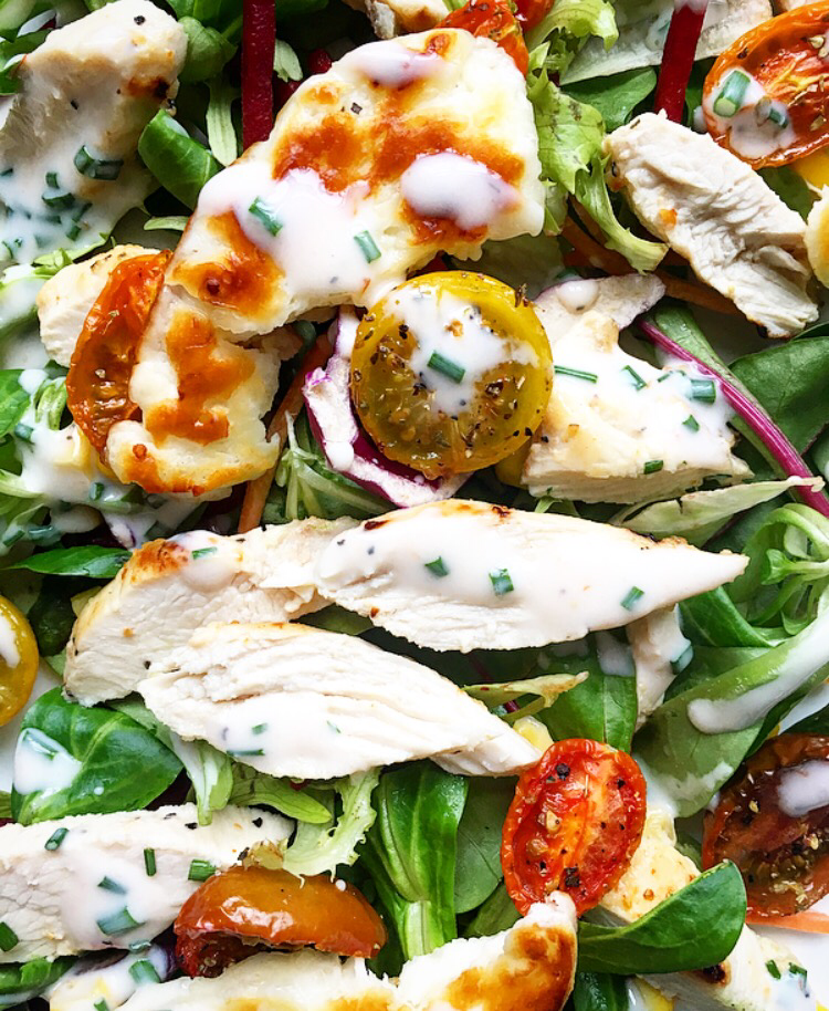 Chicken, Tomato & Halloumi Salad with Chive & Buttermilk Dressing.