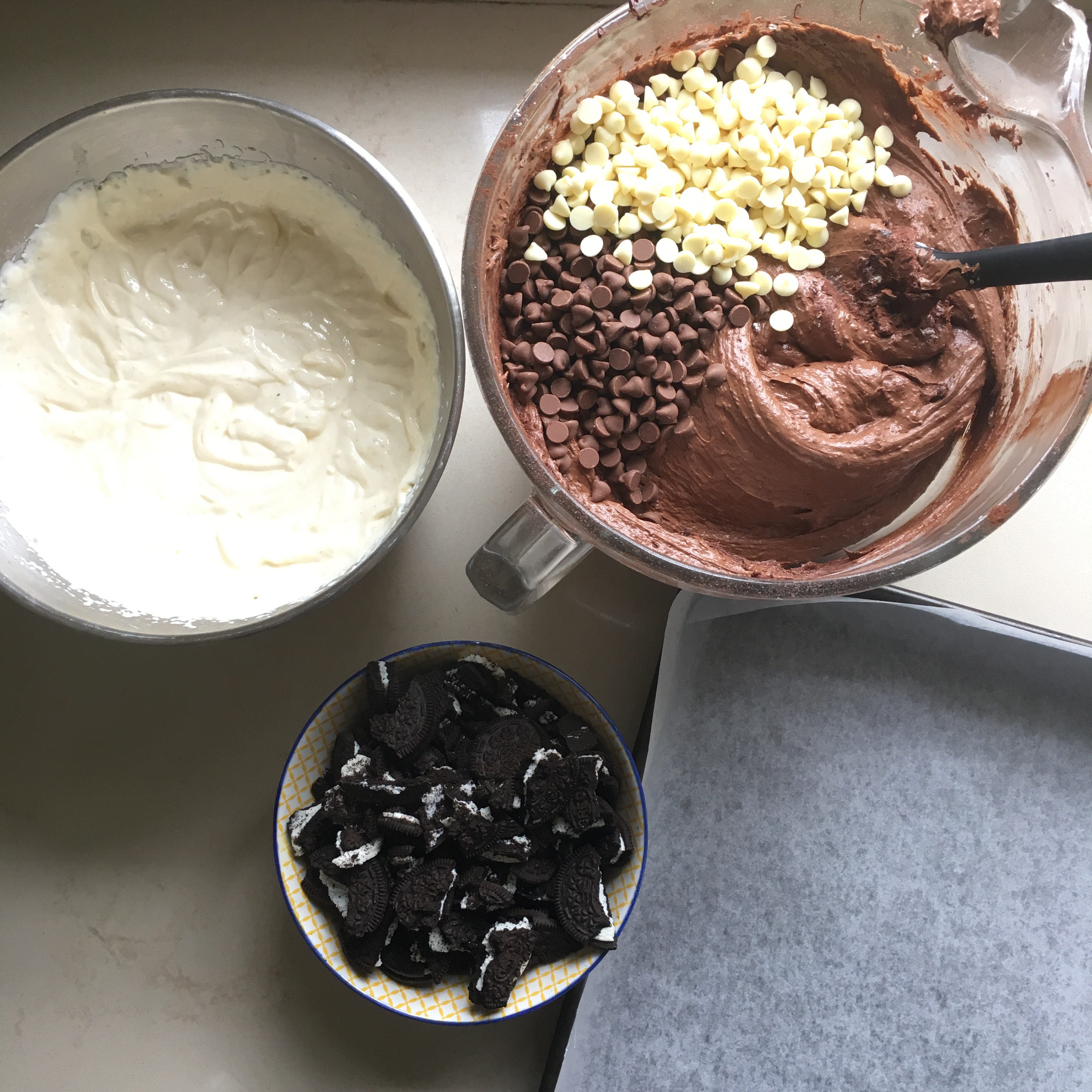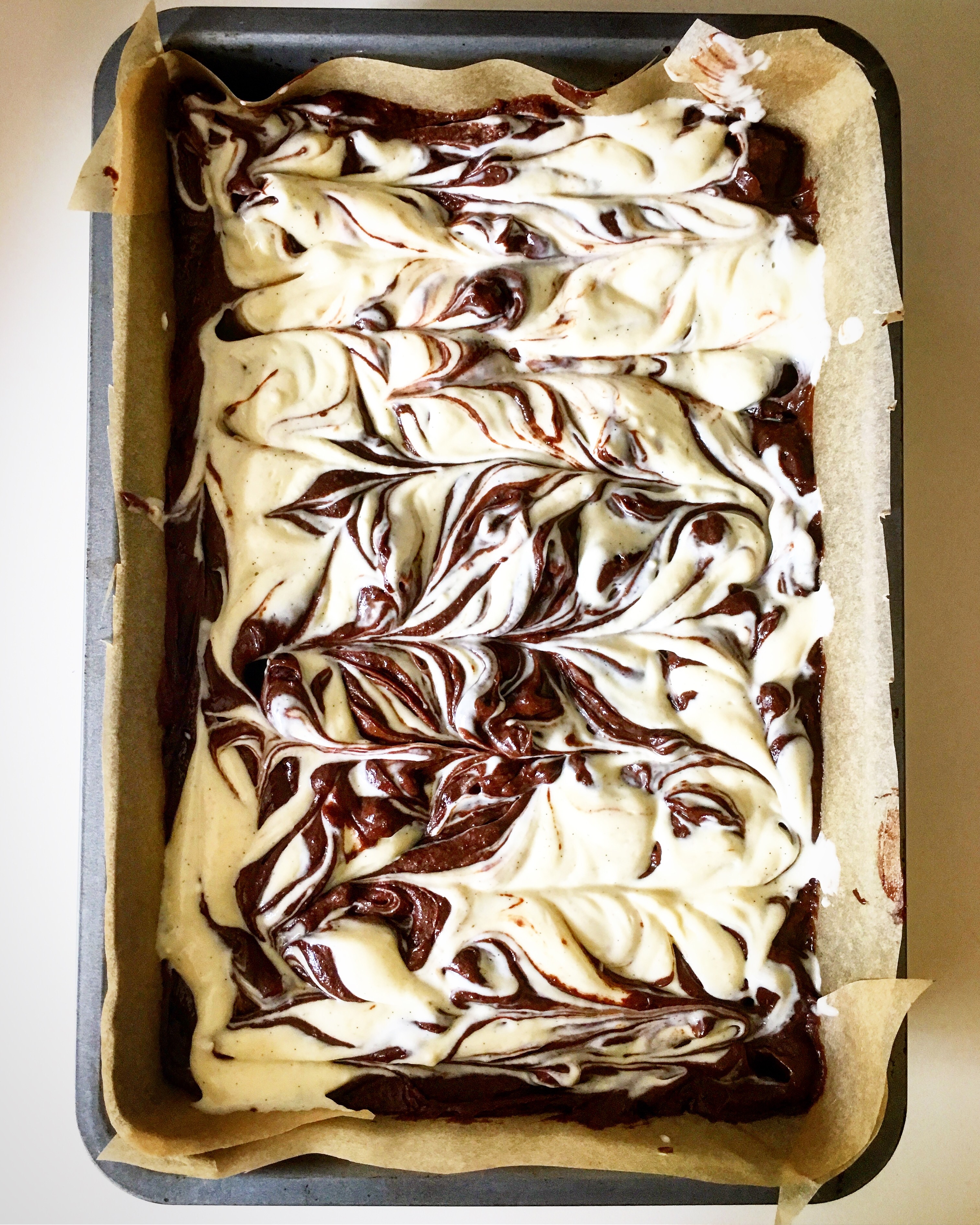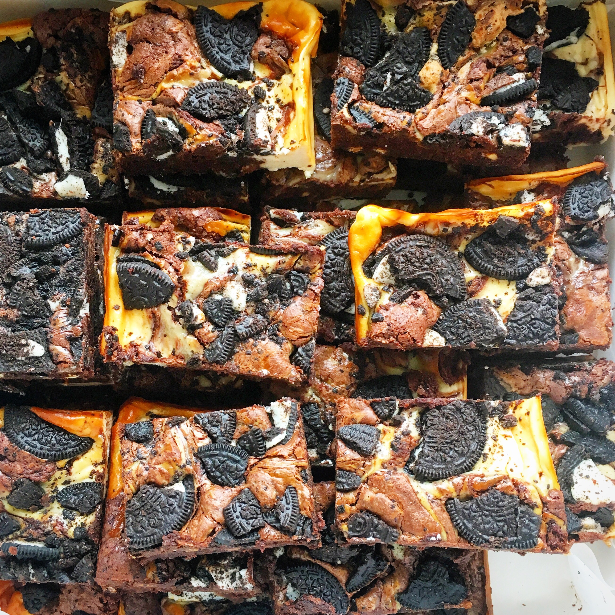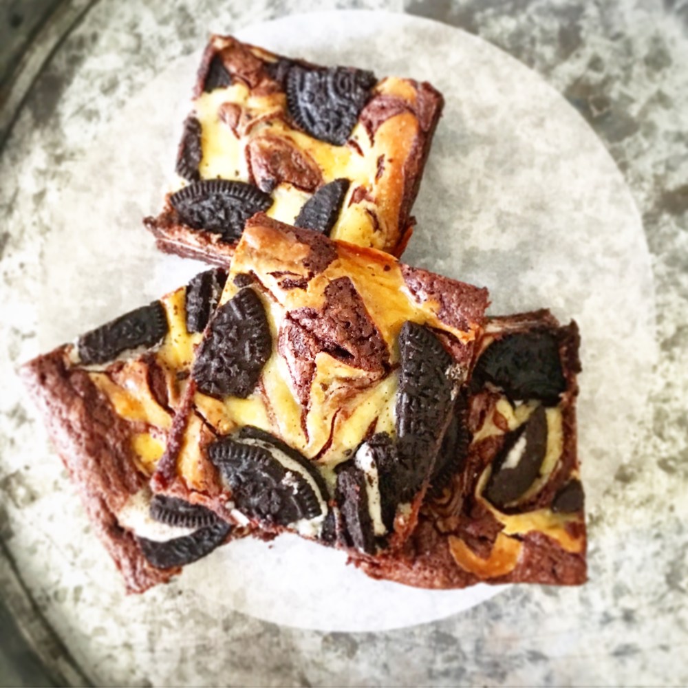Spoon big blobs of brownie mix into the tray leaving room for the cheesecake then pour or spoon that into the gaps. Use a chopstick or kebab stick to marble and combine the two layers together. (See video) You want it to all merge so you get a little cheesecake in each chunk. Top with the Oreos. Bake for 35-40 minutes, (check after 35 but they may take even longer especially if you’re usina smaller size tin) until when you shake the tray there is just a slight wobble in the centre. Cool then cut into squares. Can be frozen or kept in an airtight container in the fridge for up to a week.