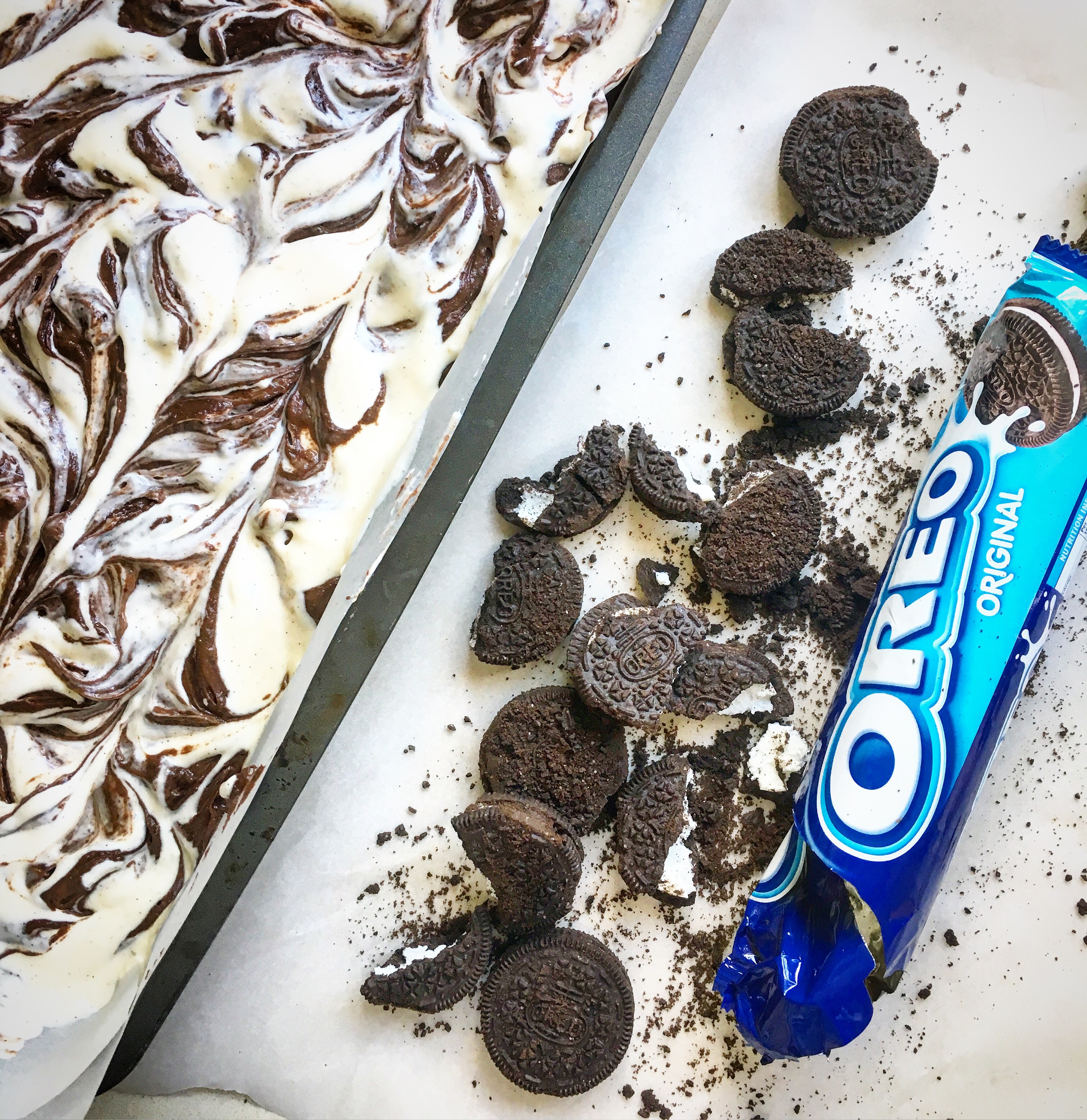 1 packet Oreo cookies, bashed to break into chunks